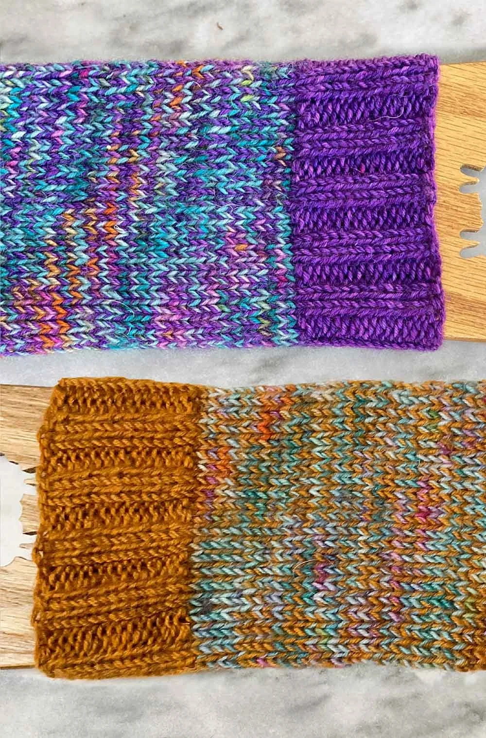 These two socks were knit with the same variegated yarn main color, but different contrasting tonal colors. The results are vastly different.